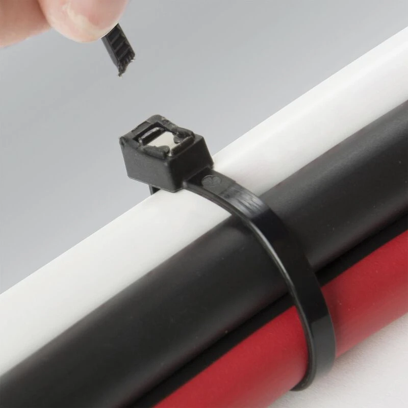 Save time and frustration using innovative self-cutting cable ties. Simply lock and twist to finish the job with no need for additional tools! Integrated stainless steel blade leaves a clean flush cut, which improves appearance and eliminates the sharp tail while maintaining a tensile strength above industry standards.