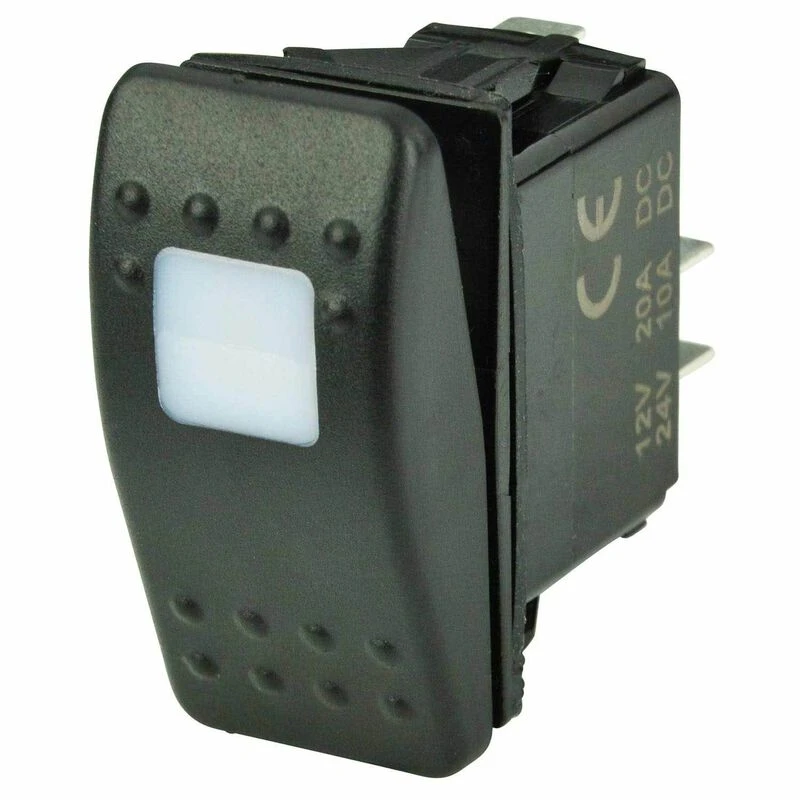 Single pole, single throw switch turns one circuit on and off. Contura switches are rated to IP66, high-pressure wash resistant. Recommended for replacements in waterproof electrical panels with rocker switches to ensure waterproof integrity. The black and gray switches and covers are interchangeable with similar switches used as original equipment on many common boat types. Nominal voltage 12V/24V DC. Rated for 20A @ 12V DC, 15A @ 24V DC. 1/4″ blade terminals. Includes one Amber LED. Snap-in mounting to fit panel hole 1.45″ x .83″ into panels .093″ to .187″ thick. Replaces Cole Hersee part number 58332-04.