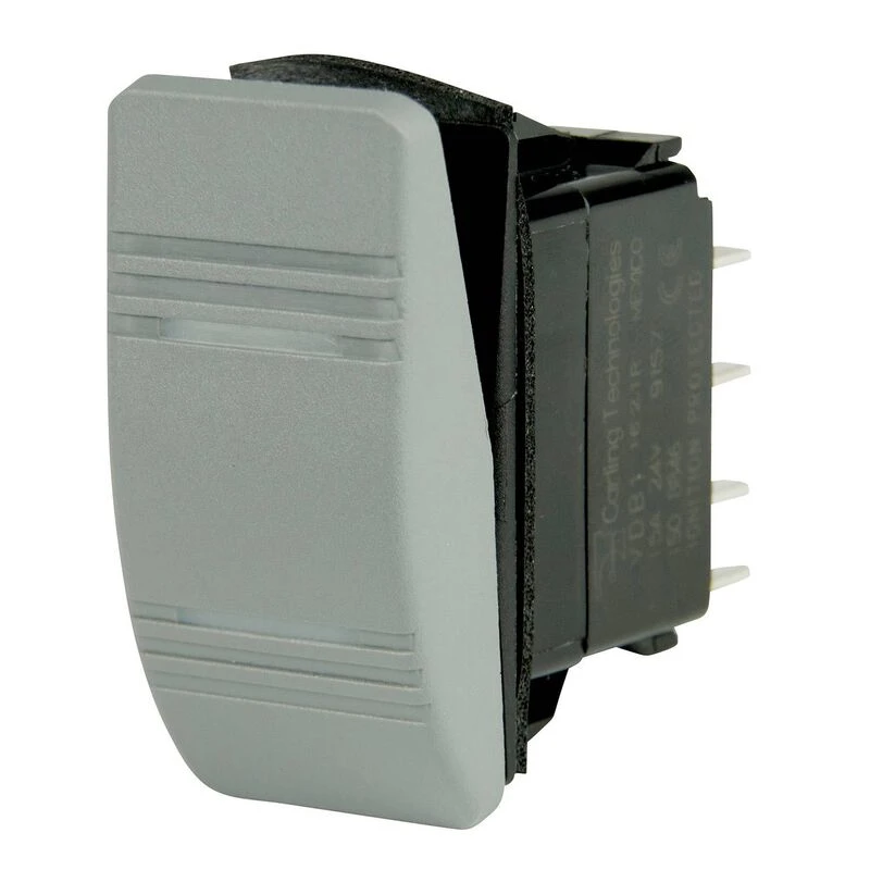 Double pole, double throw switch turns two of four circuits on at the same time. Common applications include hallway style light switching and switching between batteries, shunts, or current transformers for multiple measurments in a single meter. Contura switches are rated to IP66, high-pressure wash resistant. Recommended for replacements in waterproof electrical panels with rocker switches to ensure waterproof integrity. The black and gray switches and covers are interchangeable with similar switches used as original equipment on many common boat types. Nominal voltage 12V/24V DC. Rated for 20A @ 12V DC, 15A @ 24V DC. 1/4″ blade terminals. Includes two Amber LEDs. Snap-in mounting to fit panel hole 1.45″ x .83″ into panels .093″ to .187″ thick.