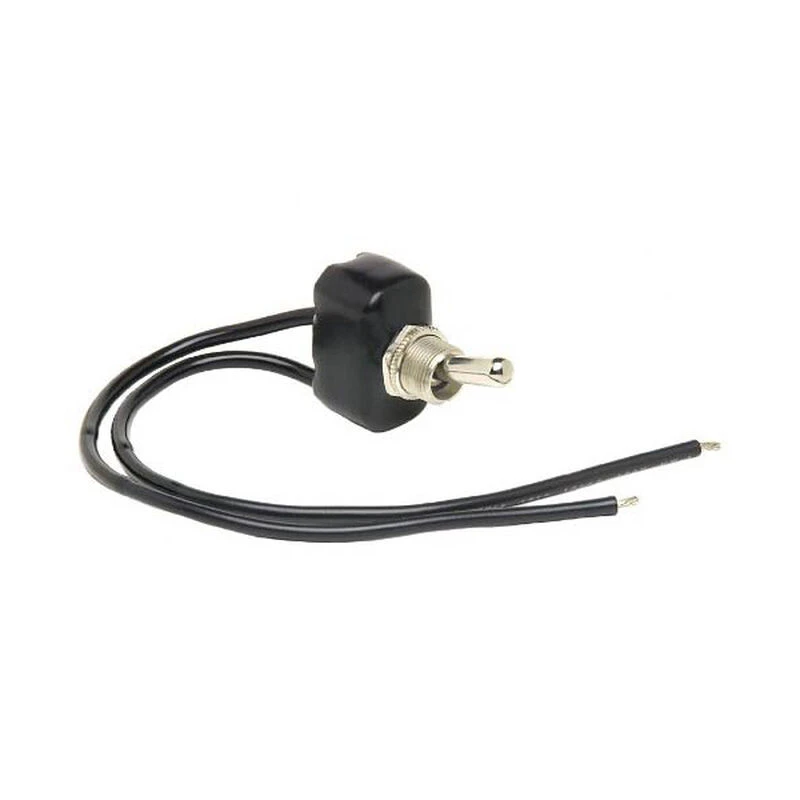 Single pole, single throw toggle switch turns one circuit on and off. Common applications include intermittent horn or windshield wiper control. This toggle switch is PVC coated. Nominal voltage is 12V/24V DC. Rated for 25A @ 12V DC, 15A @ 24V DC. 8″ 16 AWG wire lead terminals. Mounting stem 15/32″ fits panels up to 1/4″ thick. Replaces Cole Hersee part number 55020-04.