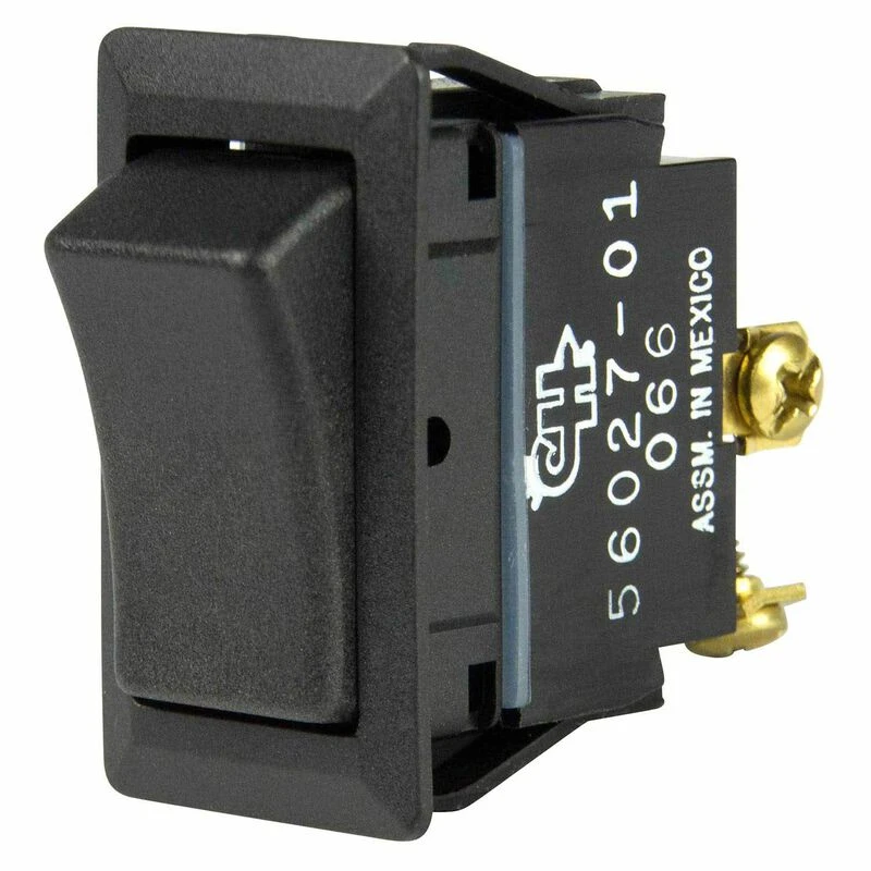 Single pole, single throw switch turns one circuit on and off. Nominal voltage is 12V/24V DC. Rated for 20A @12V DC, 10A @ 24V DC. Two #8-32 screw terminals. Snap-in mounting to fit panel hole 1.45″ x .83″ into panels .093″ to .187″ thick. Replaces Cole Hersee part number 56027-01.