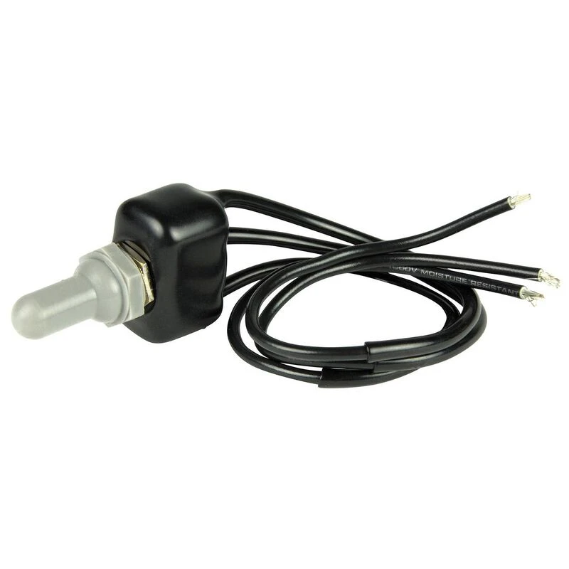 Single pole, double throw toggle switch turns one of two circuits on and off. Common applications include combining nav lights and anchor light with independent bulbs. Completely sealed switches built to stand up to the most extreme conditions. Engineered to IP67 specifications utilizing a double o-ring within a bushing at the toggle and a full epoxy seal at the back. Nominal voltage is 12V/24V DC. Rated for 25A @ 12V DC, 15A @ 24V DC. 8″ 16 AWG wire lead terminals. Mounting stem 15/32″ fits panels up to 1/4″ thick. Replaces Cole Hersee part number 55036-14.