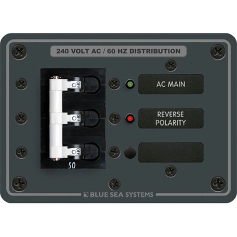 Blue Sea Systems traditional metal breaker panels have been installed in boats for years. They have become the standard for reliability and design. A wide variety of breaker styles and ratings make these panels an easy choice for most electrical systems. This AC panel provides a great way to control 120V or 240V AC power. It is comes pre-wired for easy installation with a 50A triple pole C-Series breaker and neutral and safety ground buses installed. Reverse polarity indicator light warns if polarity is switched; a not too uncommon situation at the dock. Pre-installed large format labels are backlit for visibility in low or not light conditions and can be changed.
