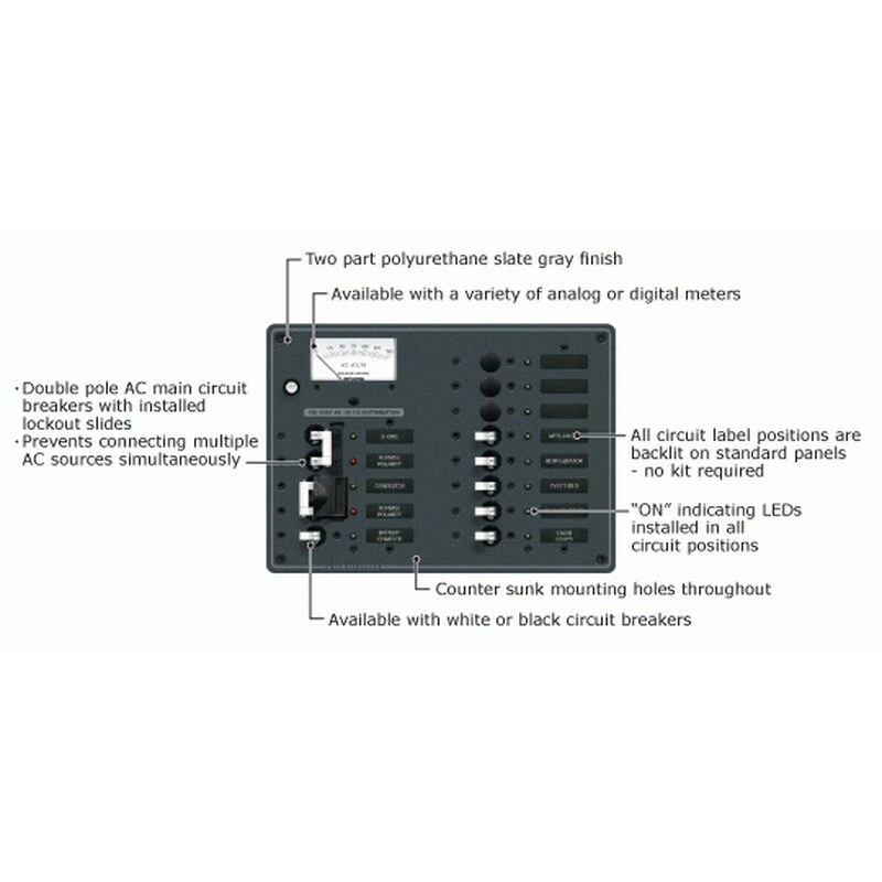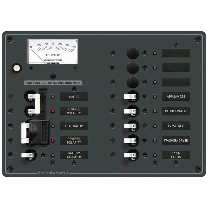This panel is best suited as an AC Main panel for applications with two power sources. It comes pre-wired for easy installation with hot, neutral, and safety ground bus bars already installed. Two A-Series 30A double pole main breakers are pre-installed and include a sliding lockout to prevent both switches from being in the ON position. AC Power from a genset, inverter, or shore power source, when combined creates a very dangerous situation. The slide lockout ensures that power sources remain separated. 15A A-series breakers are pre-installed (except 8032) for DC branch circuits. Open positions are left in each panel to allow for expansion or customization to circuit protection needs. All breakers combine switching and circuit protection and are trip-free and cannot be held in the ON position when a fault is detected. A red LED reverse polarity indicator light warns if polarity is switched; a not too uncommon situation at docks. A green LED at all positions indicates switch is ON. Large format labels are backlit for visibility in low or no light conditions. Panels that include analog voltmeter and ammeter to provide users with a way to monitor batteries. Included are 30 commonly used AC labels and 30 commonly used DC labels.