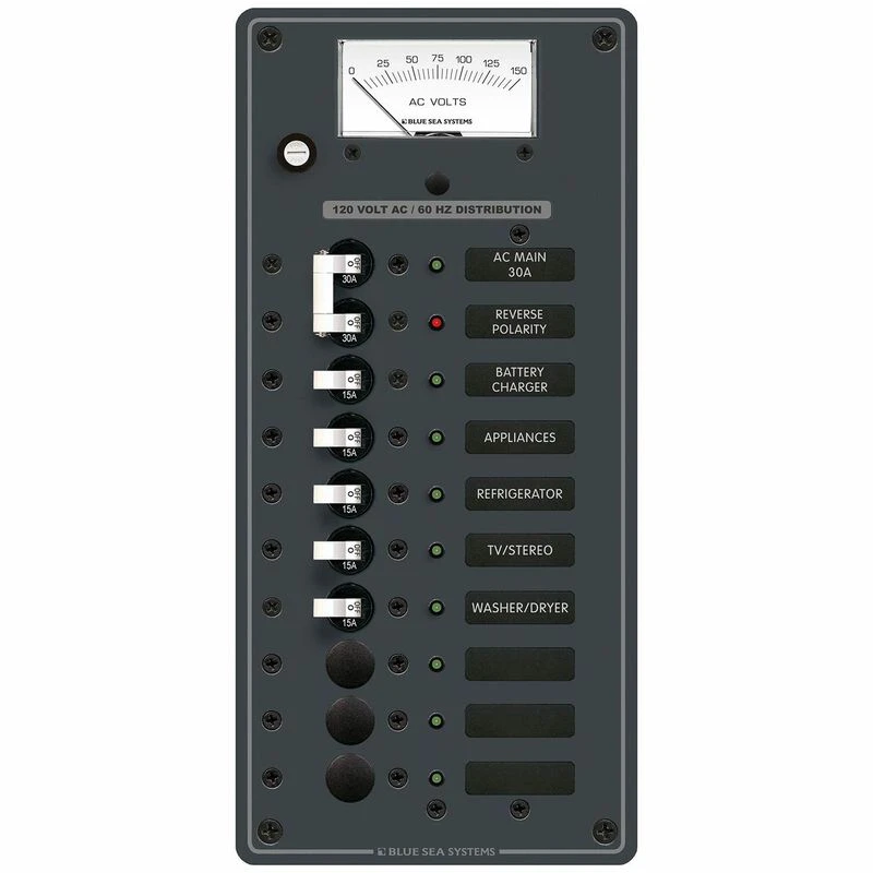 This panel is best suited for a boat with an average number of AC circuits and serves as an AC Main panel with space for eight AC branch circuits. It comes pre-wired for easy installation with hot, neutral, and safety ground bus bars already installed. The AC voltmeter provides valuable system information to keep you on top of systems changes before they become issues. An A-Series double pole 30A AC main breaker and eight 15A A-series breakers are pre-installed for AC branch circuits and leave three open positions for customization or expansion. All breakers combine switching and circuit protection and are trip-free and cannot be held in the ON position when a fault is detected. A red LED reverse polarity indicator light warns if polarity is switched. A green LED at all positions indicates switch is ON. Large format labels are backlit for visibility in low or no light conditions. 30 commonly used AC labels are included.