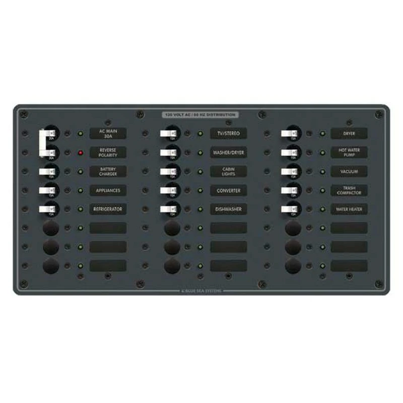 Blue Sea Systems panels are visually similar to many factory-installed panels, so they will fit in attractively with existing controls. Panel heights and widths comply with industry standards, so mounting is easy. Cruisers will appreciate the easy-to-use, circuit breakers with flush-fitting backlit labels. Bright LED panel lights clearly indicate when circuits are on. Breaker panels include pre-wired buses and a set of 30 common labels. The toggle-style magnetic circuit breakers meet all North American and European CE standards and are 12 and 24V capable. Circuit breaker panels include pre-wired buses, backlighting and a set of labels. More than 500 additional labels are available for use with these panels.