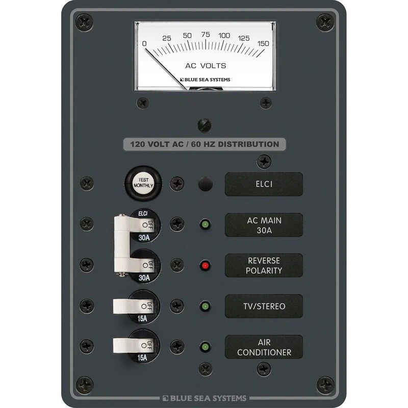 This panel comes pre-assembled with A-Series ELCI main that will trip if there is an imbalance in current between hot and neutral conductors caused by a faulty ground or ground fault. Two additional A-Series 15A branch breakers are provided for AC circuits. An AC analog voltmeter provides valuable system information and allows users to monitor changes in the system before they become issues. Green LEDs indicate the breakers are in the ON position and a Red LED alerts users to reverse polarity. Installation of an ELCI breaker, when installed following their guidelines, meets ABYC E-11 requirements.