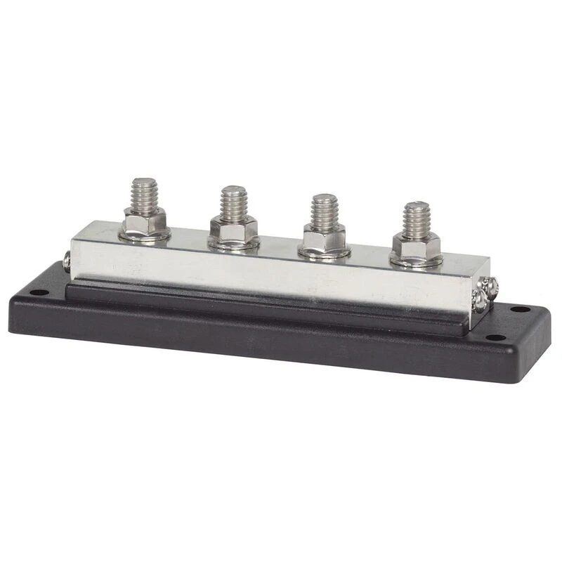 A heavy duty high amperage bus bar for DC mains on larger boats and other high-current circuits