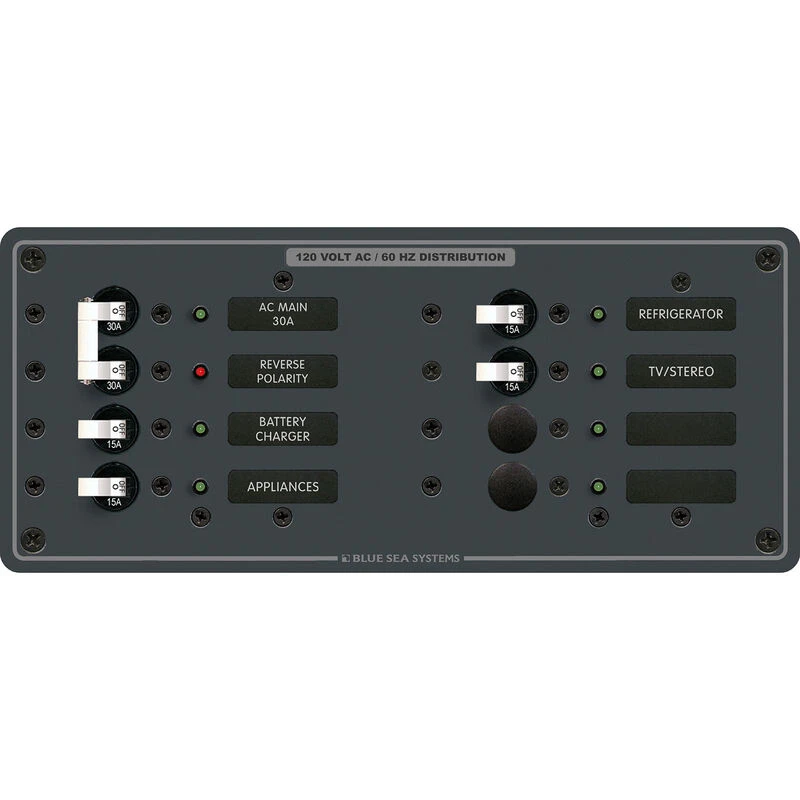 This panel is best suited for a boat with a handful of AC circuits and serves as an AC Main panel with space for six AC branch circuits. It comes pre-wired for easy installation with hot, neutral, and safety ground bus bars already installed. An A-Series double pole 30A AC main breaker and four 15A A-series breakers are pre-installed for AC branch circuits and leave two open positions for customization or expansion. All breakers combine switching and circuit protection and are trip-free and cannot be held in the ON position when a fault is detected. A red LED reverse polarity indicator light warns if polarity is switched. A green LED at all positions indicates switch is ON. Large format labels are backlit for visibility in low or no light conditions. 30 commonly used AC labels are included.