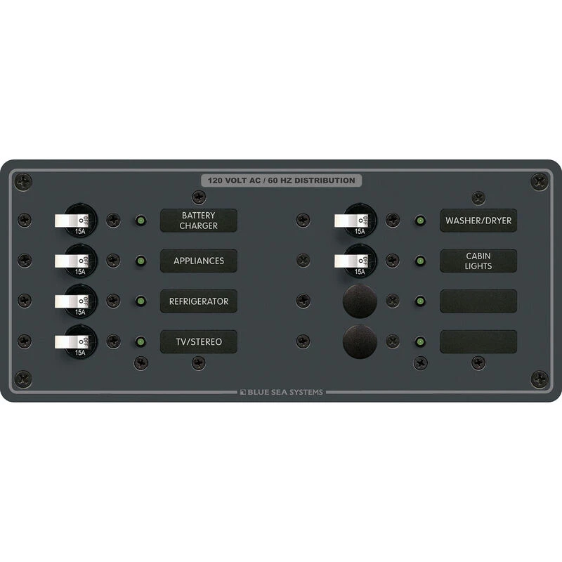 Ideal for adding AC circuits to an existing system or as a dedicated AC branch panel when main AC switching is controlled from a separately panel, this panel comes pre-wired for easy installation with hot, neutral, and safety ground bus bars already installed. Six pre-installed 15A A-series breakers are feed AC branch circuits; two positions are left open for customization or expansion. All breakers combine switching and circuit protection and are trip-free and cannot be held in the ON position when a fault is detected. A green LED at all positions indicates switch is ON. Large format labels are backlit for visibility in low or no light conditions. 30 commonly used AC labels are included.