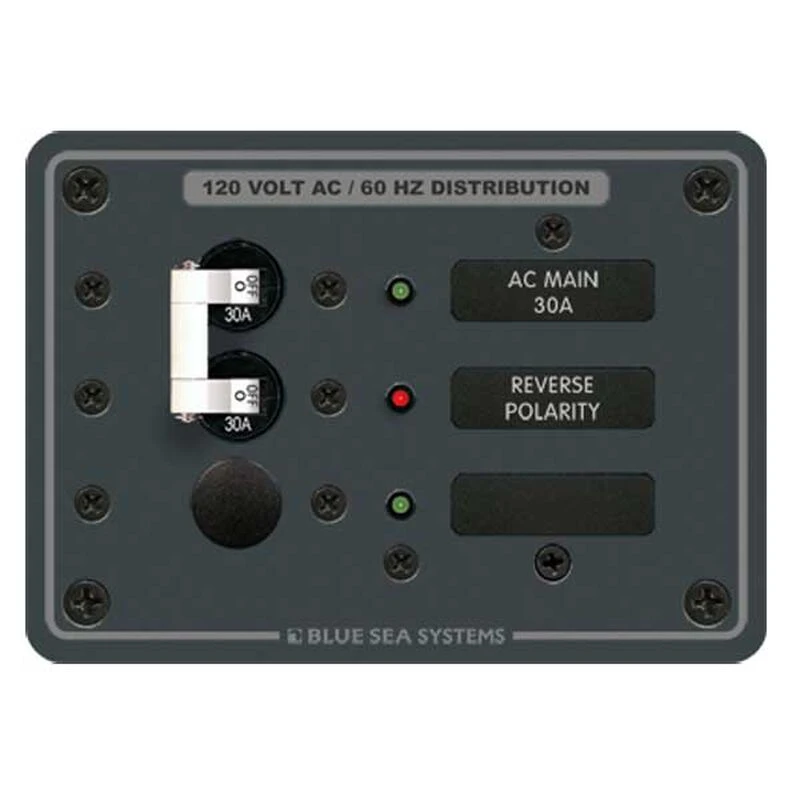 This panel is best suited as an AC Main panel with a space for DC branch circuits. It comes pre-wired for easy installation with. hot, neutral, and safety ground bus bars already installed. An A-Series double pole 30A main breaker is pre-installed and a space is left open and ideal for expansion or customization to circuit protection needs. All breakers combine switching and circuit protection and are trip-free an cannot be held in the ON position when a fault is detected. A red LED reverse polarity indicator light warns if polarity is switched; a not too uncommon situation at docks. A green LED at all positions indicates switch is ON. Large format labels are backlit for visibility in low or no light conditions.