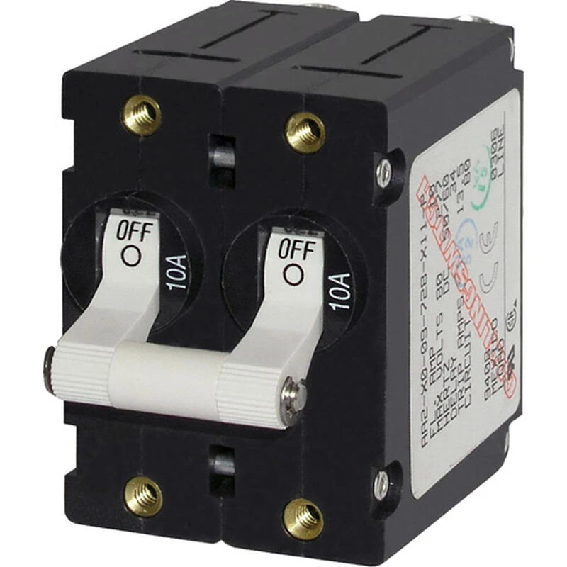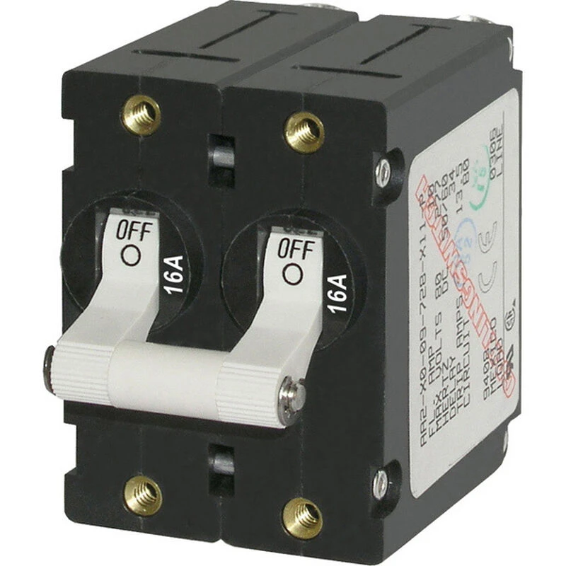Rarely will a breaker panel come pre-installed with the exact circuit protection your system requires. Each electrical system is unique to the boat and the boat owner. It is inevitable that breakers will have to be changed to meet the demands of the existing or changing electrical loads. Blue Sea Systems makes it simple. The A-Series circuit breakers combine circuit protection and switching into a double linked toggles and are designed to fit Blue Sea Systems panels for a quick change to the correct protection. All A Series breakers are now CE marked and continue meet ABYC and USCG standards. These breakers are capable of handling short start-up current surges found in electric motors and other appliances without tripping. For added safety, a Trip-Free feature prevents the toggle from being held in the ON position when a fault is detected. These double pole breakers are available in 10A-50A protection ratings.