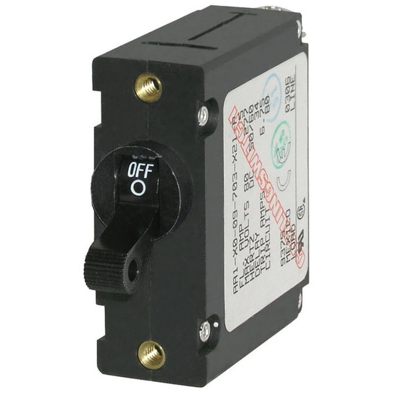 Electrical systems are unique to each boat and boater. With additions or modifications to equipment and accessories a change is usually required at the breaker panel. Blue Sea Systems makes it simple. The A-Series circuit breakers combine circuit protection and switching into a toggle switch and are designed to fit Blue Sea Systems traditional metal panels for a quick change to the correct protection. All A Series breakers are now CE marked and continue meet ABYC and USCG standards. These breakers are capable of handling short start-up current surges found in electric motors and other appliances without tripping. For added safety, a Trip-Free feature prevents the toggle from being held in the ON position when a fault is detected. These single pole breakers are available in 5A-50A protection ratings. Molded in lettering on the actuator provide a clear indication when a switch is in the OFF or ON position.