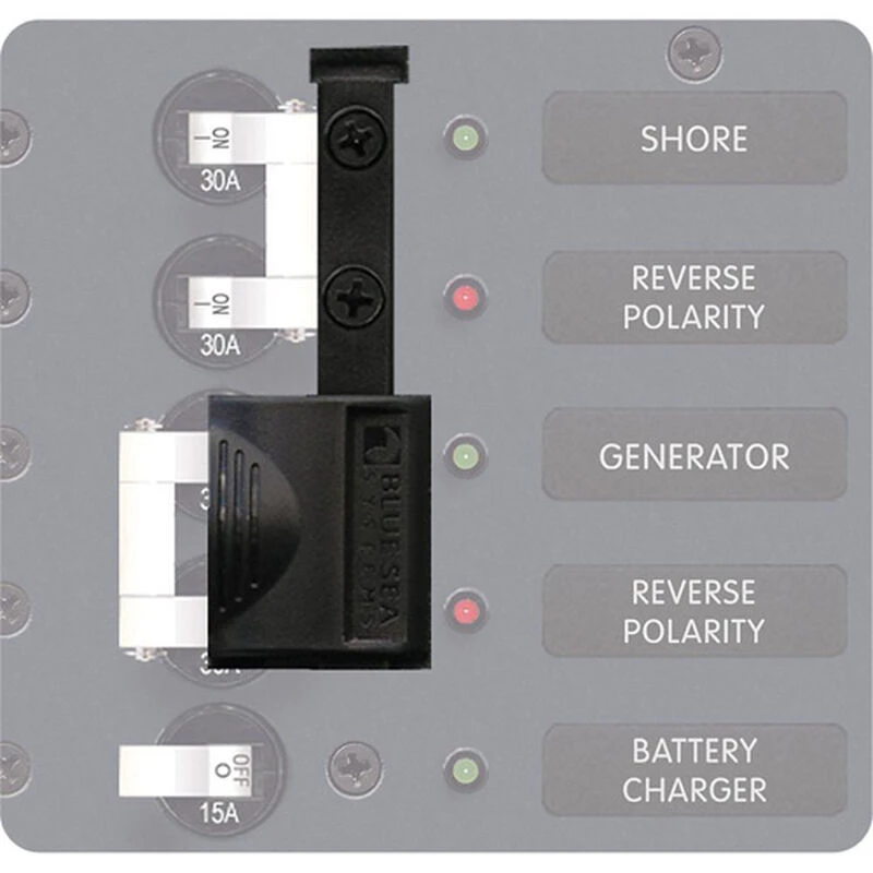 Two sources of AC power must never be connected. Power from a genset, inverter, or shore power source, when combined creates a very dangerous situation. To ensure this does not occur, Blue Sea Systems designed a sliding lockout to prevent two double pole breakers for being switched to the ON position at the same time. The lockout easily secures to the breaker panel using the breaker mounting fasteners and doesn’t require panel modifications. Simply slide the lockout to isolate the unwanted power source breaker in the OFF position leaving the desired power source free to switch; slide can only be moved while switches are in OFF position.