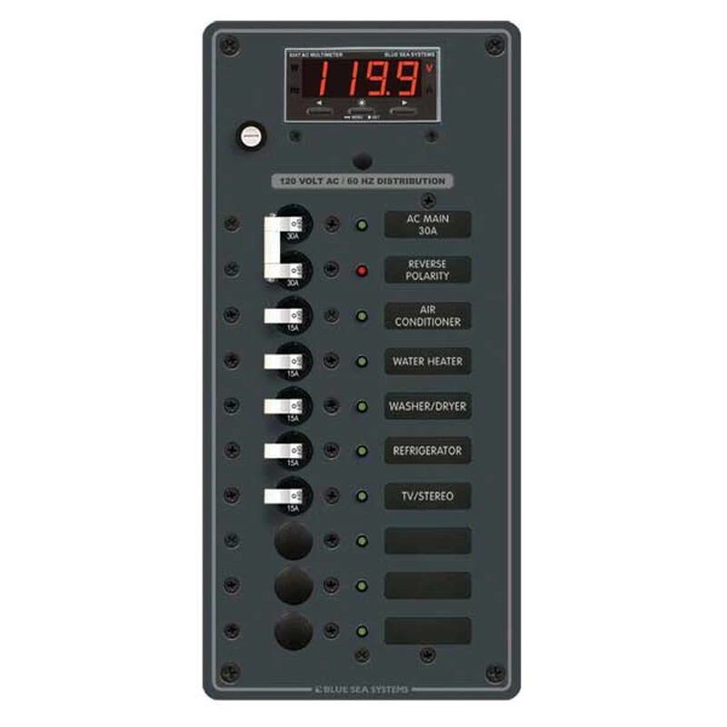 This panel is best suited as an AC Main panel with space for AC branch circuits. It comes pre-wired for easy installation with. hot, neutral, and safety ground bus bars already installed. A digital multimeter can be programmed to provide voltage, amperage, frequency, and kilowatts; alarms can be set at desired benchmarks. An A-Series double pole 30A main breaker and five 15A A-series breakers are pre-installed for AC branch circuits leaving three open positions; ideal for expansion or customization to circuit protection needs. All breakers combine switching and circuit protection and are trip-free and cannot be held in the ON position when a fault is detected. A red LED reverse polarity indicator light warns if polarity is switched; a not too uncommon situation at docks. A green LED at all positions indicates switch is ON. Large format labels are backlit for visibility in low or no light conditions. Included are 30 commonly used AC labels.