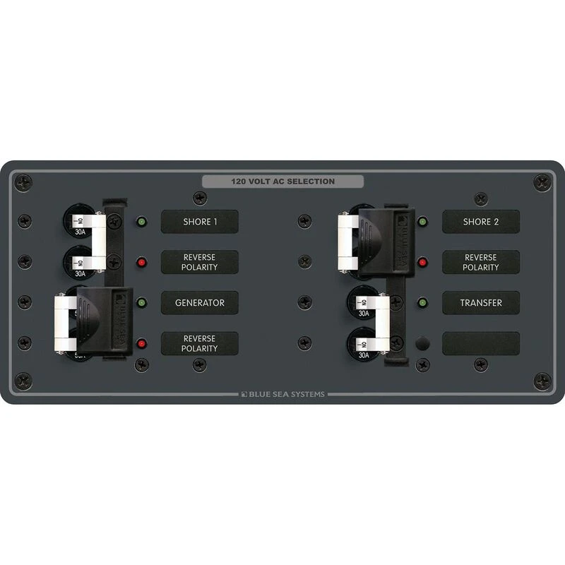 Anytime two or more AC sources are present onboard, it is critical they remain separated. AC Power from a genset, inverter, or shore power source, when combined with another AC source creates a very dangerous situation. Blue Sea Systems designed this panel simplify switching from three AC power sources with the ability to dedicate a specific power source to a group of circuits. Two A-Series 30A double pole main breakers are pre-installed and include a sliding lockout to prevent both switches from being in the ON position and ensure that only one source can be switched ON at one time. A single A-Series 50A double pole main breaker and a single A-Series 30A double pole transfer breaker also share a sliding lockout. All breakers combine switching and circuit protection and are trip-free and cannot be held in the ON position when a fault is detected. Hot, neutral, and safety ground bus bars are pre-installed. Red LEDs reverse polarity indicator lights warn if polarity is switched. Green LEDs at all positions indicates switch is ON. Large format labels are backlit for visibility in low or no light conditions. Included are 30 commonly used AC labels.