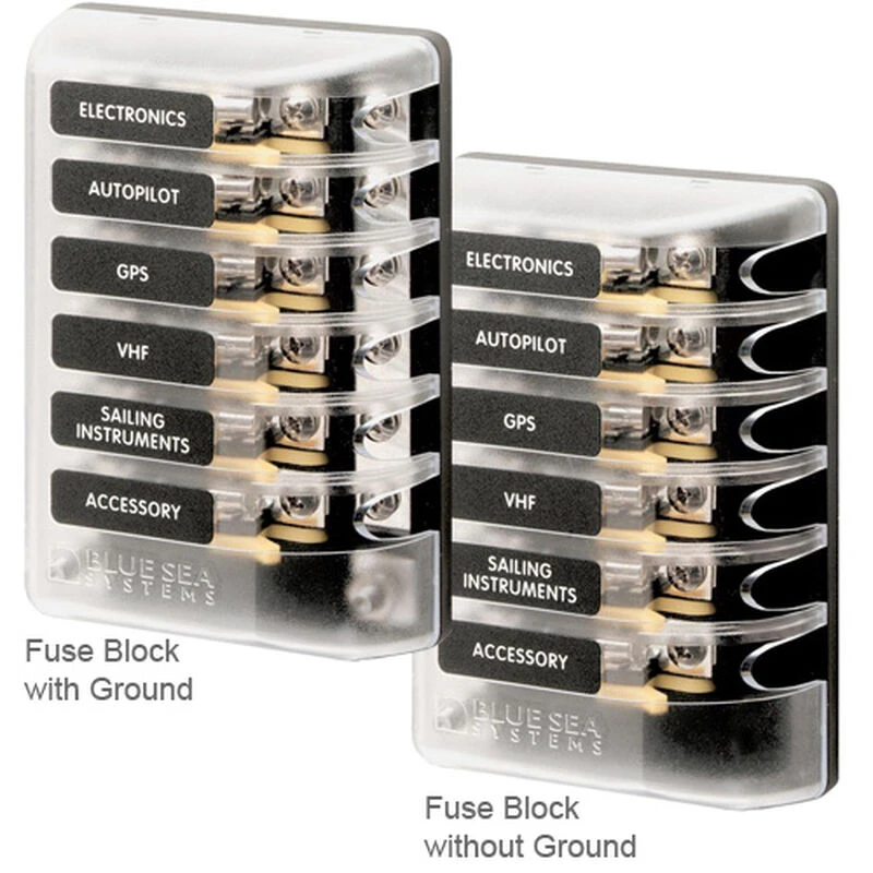 Blue Sea Systems has added some helpful features to ST glass fuse blocks. The insulating cover adds space to accept easy to read labels and satisfies ABYC and USCG requirements for insulation. Spare fuses store neatly in the cover. Fuses are spaced in a manner to make them easier to remove and install. Available with or without a ground bus to match the application. Corrosion resistant tin-plated copper buses and phosphor bronze fuse clips are made for marine applications will provide years of service.