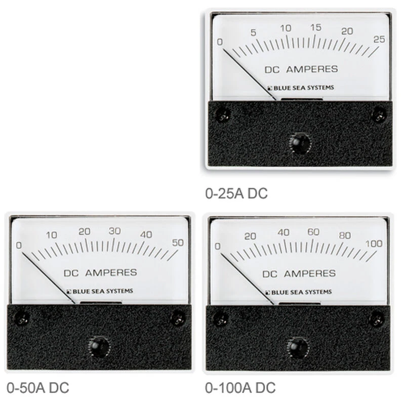 Voltmeters provide important information needed to maintain batteries and keep you out on the water or off the grid longer. They can indicate a battery’s charge or the voltage output from alternators, solar panels and other charging sources. Blue Sea Systems offers a wide range of purpose built analog voltmeters with a modern “flat scale” design that makes precise reading easy. Choose a display size and specific amp range to monitor just the information that is important. The compact size and simple four-wire connection (two wire for AC units) make surface mounted or panel mounted installation straightforward. Each ammeter includes the appropriate internal or external shunt and is backlit with an LED for use in low or no light conditions.
