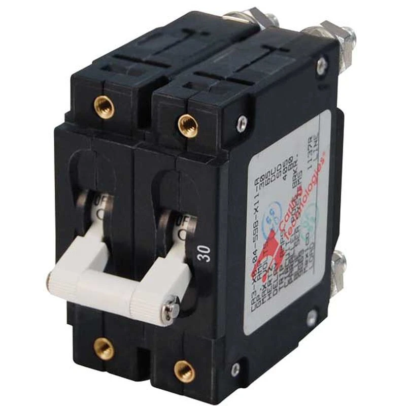 It is inevitable that breakers will have to be changed to meet the demands of existing or changing electrical loads. Blue Sea Systems makes it simple. The C-Series circuit breakers combine circuit protection and switching in a toggle switch designed to fit Blue Sea Systems panels. These breakers are capable of handling short start-up current surges found in electric motors and other appliances without tripping. For added safety, a Trip-Free feature prevents the toggle from being held in the ON position when a fault is detected. A trip will occur if a fault is detected on any of the poles. These double and triple pole breakers are ideal for a windlass, inverter, stern or bow thruster, or other high amperage loads.