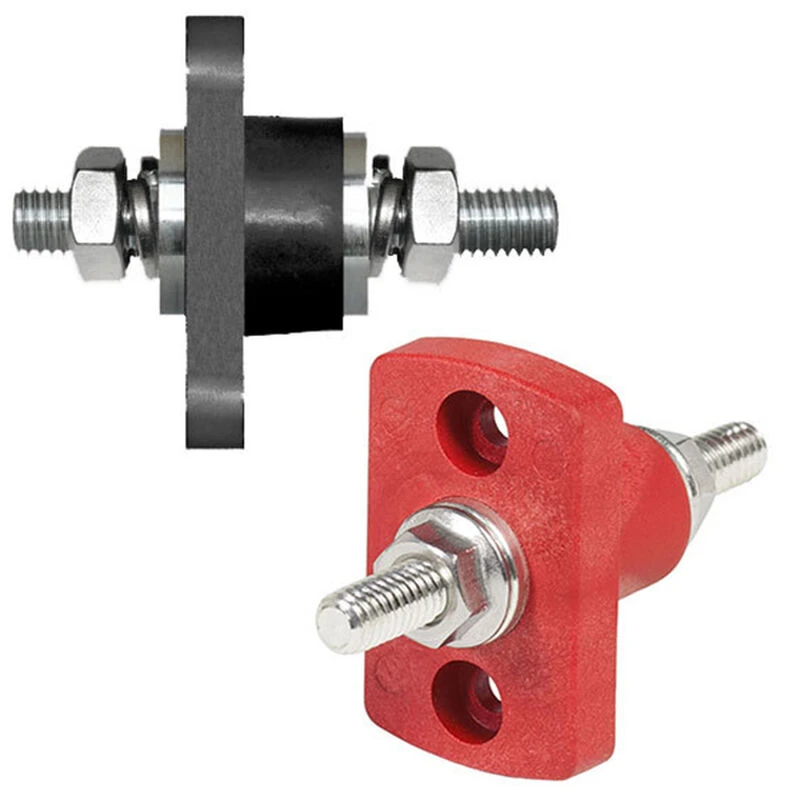 Cables that pass through bulkheads, decks or any hard surface are subject to damage caused by movement and vibration. Chafe guards, grommets and additional protection can be installed, but can wear over time and do not provide a watertight seal. Blue Sea Systems designed these feed-through terminals to eliminate these issues. Available in Red or Black 5/16″-18 and 3/8″-16 stud terminals to meet the needs of the application. A reinforced thermoplastic body isolates the terminal stud from bulkhead material and provides and flange and fastener holes to create a water-tight installation. Ideal for windlasses and electric winches installations.