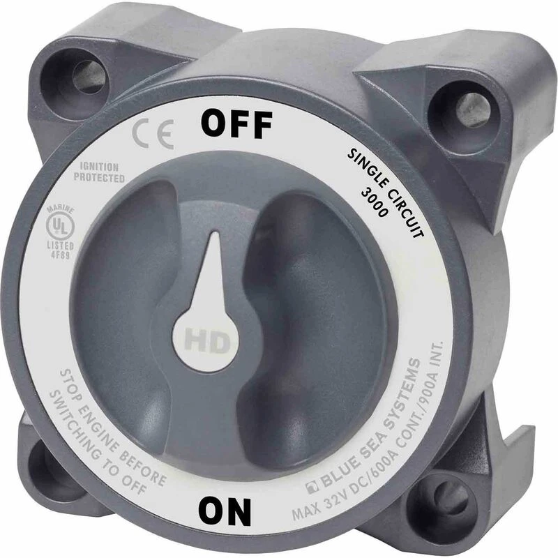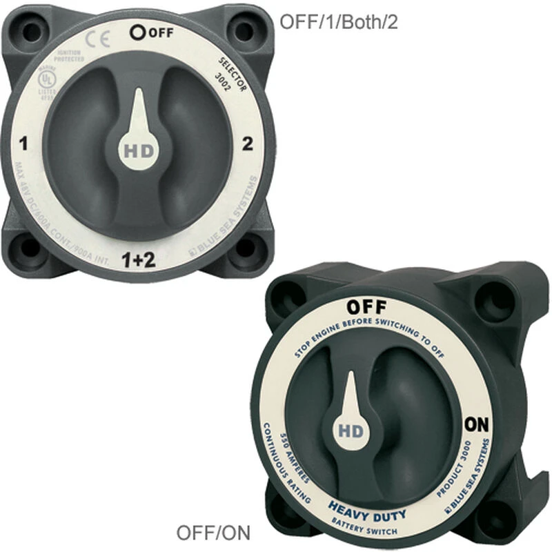 Blue Sea Systems heavy duty battery switches have a compact footprint, but carry incredible electrical loads. Built on the same chassis as the e-Series switches they can be easily installed in a variety of locations. The Heavy-Duty series are ignition protected and can be located in the engine rooms of gasoline powered boats.