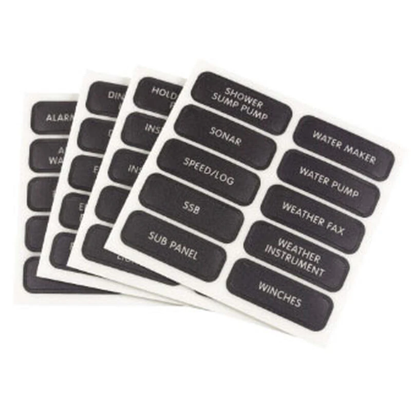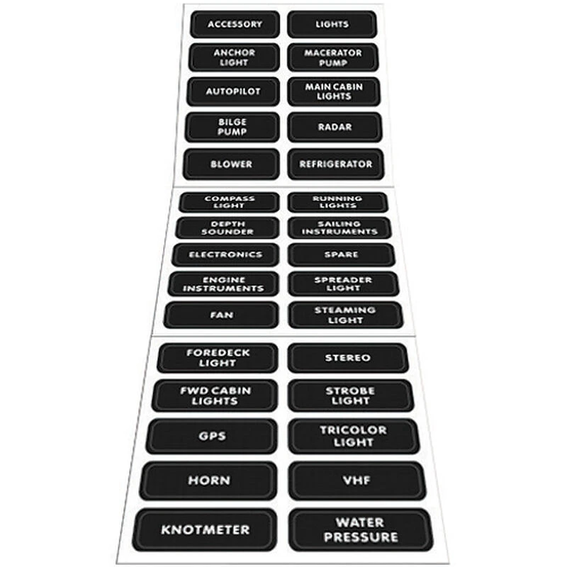 Blue Sea Systems large format labels are a great way to finish the installation of a new panel or update an existing panel to include any additions or changes. These durable weatherproof labels can be backlit (depending on the panel) and come in four configurations to satisfy most applications. Basic AC and Basic DC sets include 30 commonly used labels. Extended AC and extended DC sets handle more complex or more specific applications and include 120 labels. See detailed lists below to choose the right set for your boat.