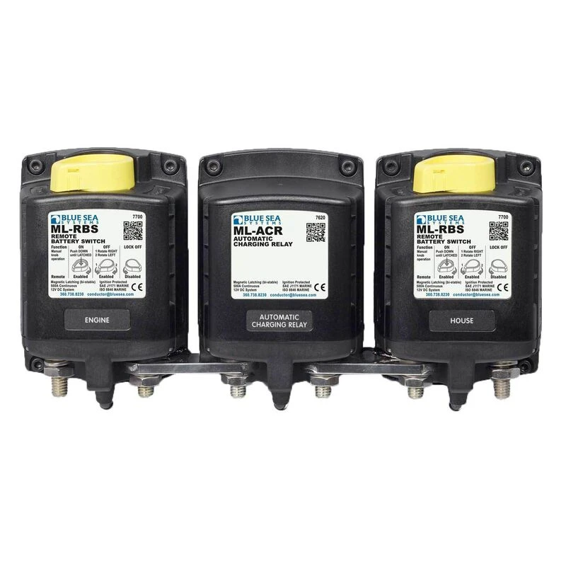 The ML-ACR (Magnetic Latch-Automatic Charging Relay) and ML-RBS (Remote Battery Switch, sold separately), when paired, provide complete battery management of large battery banks with the push of a button. In addition to automatically sharing the charge from an engine’s alternator between the start and auxiliary battery, the ML-ACR control switch combines batteries momentarily to assist with starting in the event an engine battery is low. With the optional Blue Sea Systems 9160 Paralleling Link Bus (sold separately), multiple remote battery switches can be easily connected to the ML-ACR for a complete remote battery management subsystem.