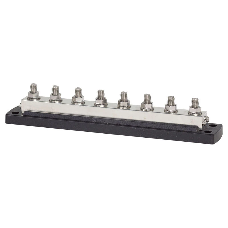 If your installation requires high amperage bus bars look no further than the PowerBar from Blue Sea Systems. This eight stud bus can handle up to 600A. Designed for use as a main DC bus on larger boats these bus bars are also ideal for generators, inverters, windlass, large davits, and other high current circuits. 3/8″ studs provide a solid anchor for larger cables and will accept the torque required to create the best possible connection. Four ¼” mounting holes are located at the ends to secure the base.Â