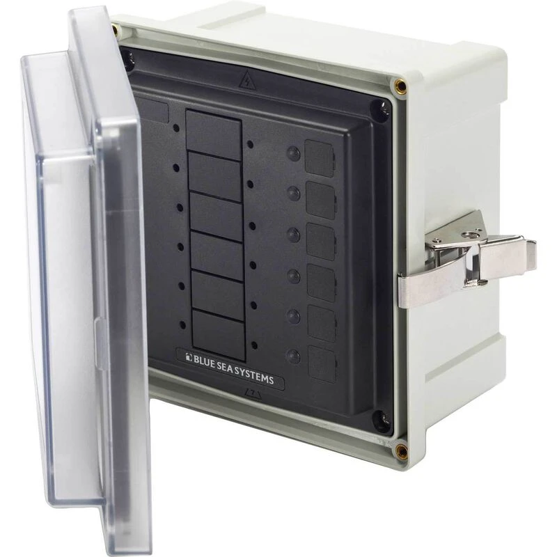 Not all circuit breakers are installed in a panel in the nav-station or at the helm. Sometimes having a dedicated box elsewhere for a smaller number of breakers is a better solution. Blue Sea Systems designed the surface mount system (SMS) for these types of installations. Ideal on work boats and breakers that are installed in exposed areas or wet lockers. These enclosures easily mount to any surface Wires are run through compatible glands that secure to knock-out holes in the bottom. The incorporated breaker mounting plate provides 6 positions to customize circuit protection and will accept single and double pole flat rocker style breakers. Using optional LED indicator lights breaker status can be viewed easily through the clear cover. A gasket, overlapping cover design and stainless steel latch work together to achieve an IP66 rating with the cover securely in place. Panel will accept included square format labels to further customize of the installation.