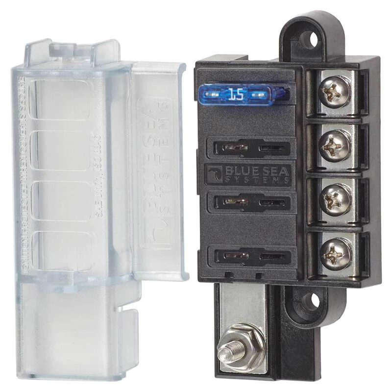 Fuse Blocks are an effective method of protection to prevent damage to wiring and possible fire in the event of an over-loaded or short circuit. This Blue Sea Systems space-saving fuse block can provide protection for new installations or when the panel has run out of breakers. Often used for electronic installations, these fuse blocks can be fed by one breaker from the distribution panel and supply power to 4 additional circuits. Terminals are located on one side to concentrate wiring and minimize the overall footprint of the fuse block. A clear cover insulates fuses and terminals from accidental contact and satisfy ABYC and USCG requirements.