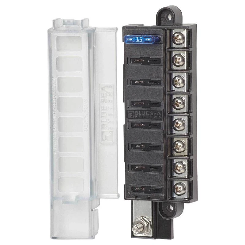 Fuse Blocks are an effective method of protection to prevent damage to wiring and possible fire in the event of an over-loaded or short circuit. This Blue Sea Systems space-saving fuse block can provide protection for new installations or when the panel has run out of breakers. Often used for electronic installations, these fuse blocks can be fed by one breaker from the distribution panel and supply power to 8 additional circuits. Terminals are located on one side to concentrate wiring and minimize the overall footprint of the fuse block. A clear cover insulates fuses and terminals from accidental contact and satisfy ABYC and USCG requirements.