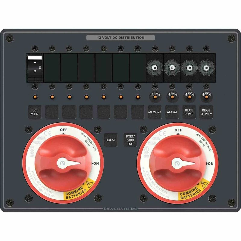Each panel is ignition protected for use on gasoline powered boats and can be mounted in four different orientations. A DC main circuit breaker and 24-hour branch circuit protection are included for accessories that do not require switching or are switched elsewhere: such as bilge pumps, CO sensors, clocks and stereos. Room for expansion is provided on each panel to add circuits and customize the installation. The Blue Sea Systems Battery management panels are great way to simplify battery management.