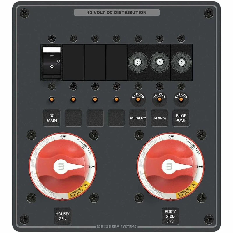 Each panel is ignition protected for use on gasoline powered boats and can be mounted in four different orientations. A DC main circuit breaker and 24-hour branch circuit protection are included for accessories that do not require switching or are switched elsewhere: such as bilge pumps, CO sensors, clocks and stereos. Room for expansion is provided on each panel to add circuits and customize the installation. The Blue Sea Systems Battery management panels are great way to simplify battery management.
