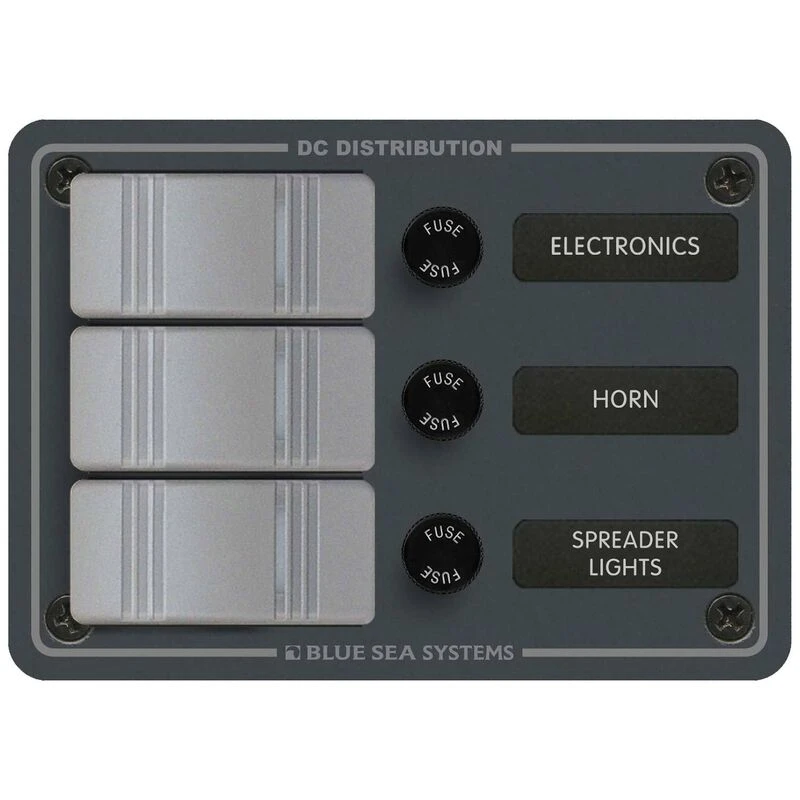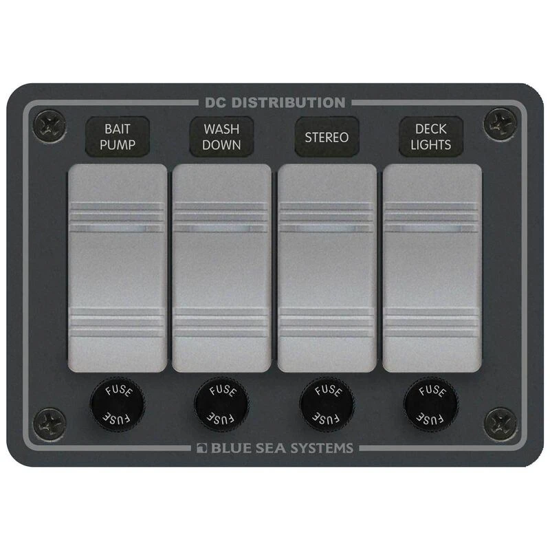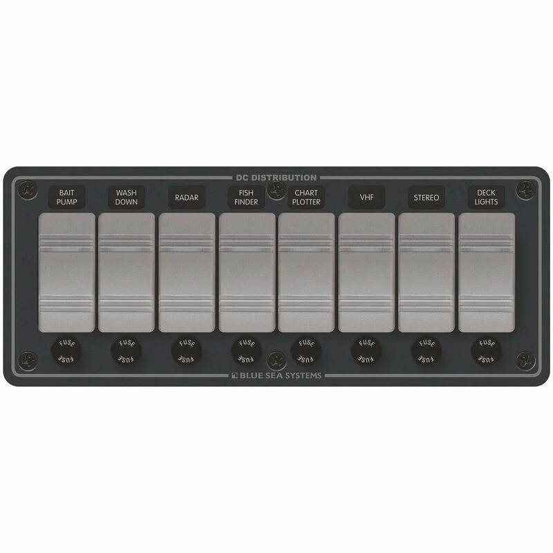 Blue Sea Systems water resistant panels are made to be exposed to the elements; including saltwater spray and washdowns. An included gasket seals the panel and protects areas behind the dash from water intrusion. These panels feature modern Contura rocker switches and look at home on almost any boat. LED lights behind each switch indicate it is ON. Each switch has a corresponding AGC (standard glass fuse) fuse that is easily accessible through a sealed cap. These pre-wired panels are available in 3, 4, 6, and 8 position panels; there is one to fit, most applications and provide an extra switch for expansion. Included 60 label set makes organizing the switches a breeze.