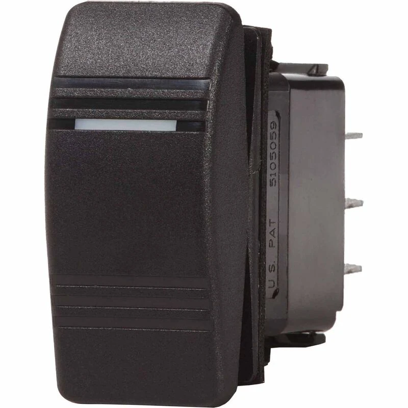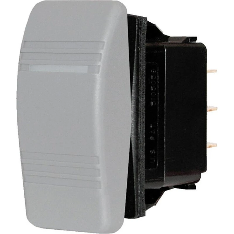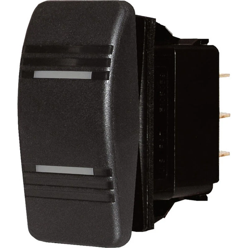 An exact replacement for switches on Blue Sea Systems Contura III water resistant panels, these 2 or 3 position switches can be used to change circuit function within the panel. Internal and external seals allow these vibration resistant switches to stand up to saltwater spray and freshwater washdowns. They are ideal for installations on the fly bridge or in open cockpits. The modern looking rocker switch features an LED to indicate which circuit is ON. Switches with two ON positions have separate LEDs to indicate which of the two circuits has power. Available in Black or Gray to match Blue Sea System panel switches. These switches can also be installed as a stand alone using the cutout template below.