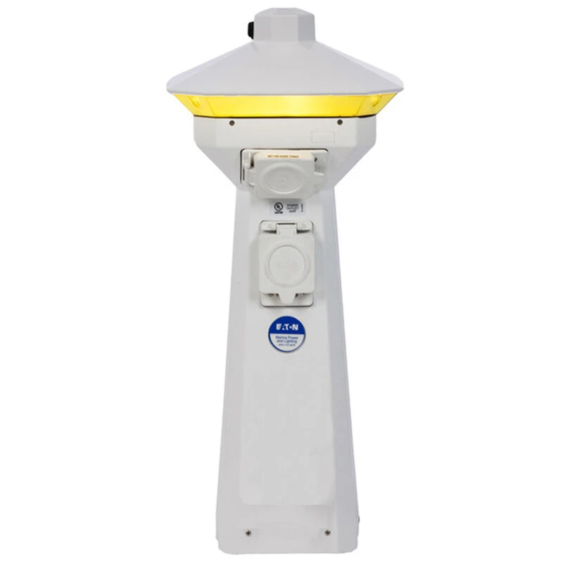 The EATON Hatteras Power Pedestal Light is an elegant and low cost solution for your shore power needs. This powerful yet compact pedestal is perfect for providing shore power connections to residential boaters or docks with limited space. Perfect for walkway lighting, decks, pools, and smaller boating applications. Standard features: white heavy resin housing with an acrylic polymer coating for a UV resistant finish, copper bus, Eaton circuit breaker protection for all receptacles and lighting, NEMA 3R rating, UL Listed, and meets electrical code requirement for shore power access.