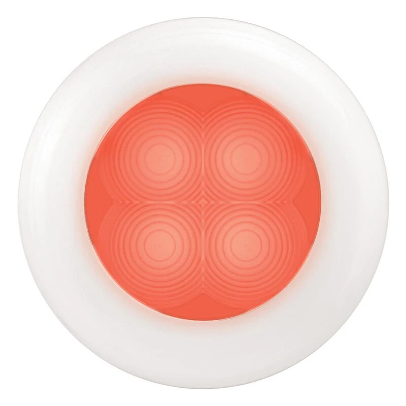 The HELLA MARINE Slim Line Round Courtesy Light is an attractive, energy-efficient, no-maintenance solution for a variety of interior and exterior lighting applications. They consume a fraction of the energy of traditional bulb lamps and run very cool due to their low current draw, providing safer installation and money savings. Advanced lens technology provides an even spread of soft light without glare or eyestrain. Feature four LEDs. Shock, impact and vibration-resistant for an ultra-long service life. Each lamp is completely sealed and waterproof (rated IP67).