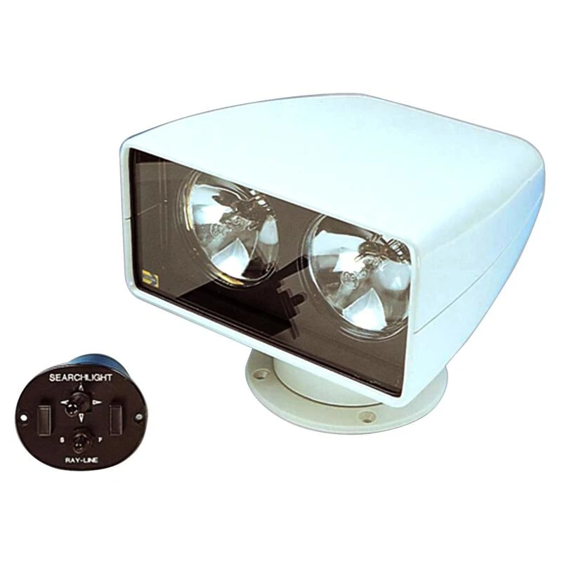 Watertight, epoxy-painted thermoplastic housing with two 100,000cp halogen sealed beam lamps. Bulbs tilt inside housing, maintaining the sleek appearance. Includes two-speed panel-mount remote control and 25′ wiring cable.