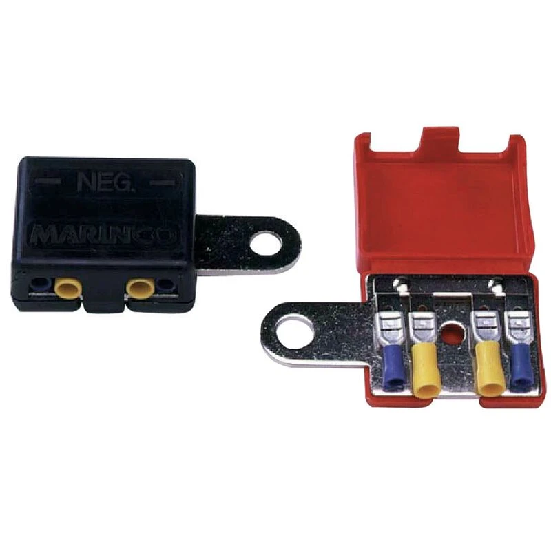 For simple applications or when constant power is required to maintain settings on electronics, look to Marinco battery direct connectors. Sold in pairs, the color coded cases open to reveal four male quick connect terminals with corresponding female terminals (included). Terminal plates have been pre-drilled specifically to match positive and negative marine battery terminals. The plastic case snaps closed to protect the terminals from accidental contact and the resulting shorts. Note: we recommend additional circuit protection as required by the manufacturers of connected equipment.