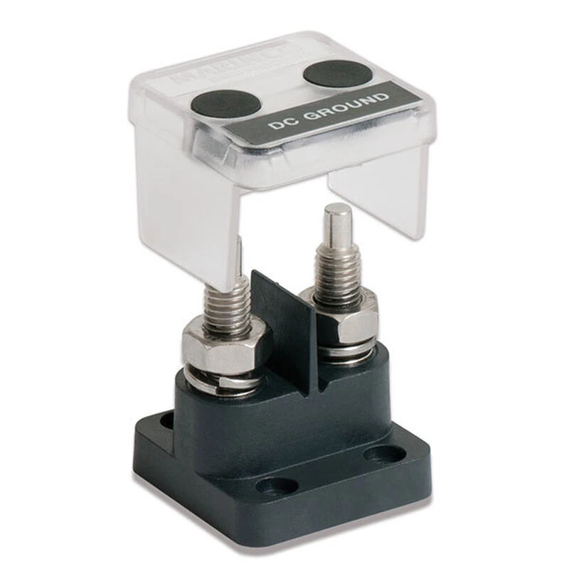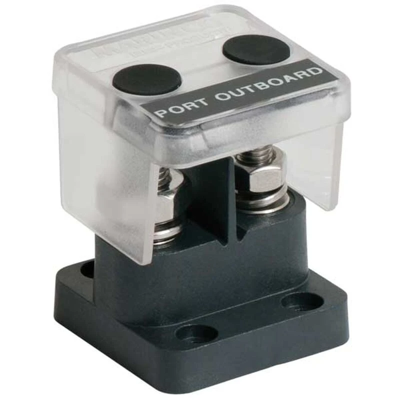 Pro Installer Insulated Studs are a smart choice for marine installers. Increased stainless steel stud length allows up to three large cable lugs to be connected. The clear polycarbonate cover provides insulation/protection, while the snap-out side skirts allow for additional cable entry. The power tapping plate versions provide additional termination points for small cables. Model 14981781 was developed for Yamaha engine installations where positive cable has 10mm (3/8″) lug, and negative cable has 8mm (5/16″) lug. Generous stud lengths allow securing of three 95mm (3/0) cable lugs. 4mm branch circuit terminals rated for 50A each. 50V DC. 1 7/8″ x 1 7/8″ x 2 3/8″.