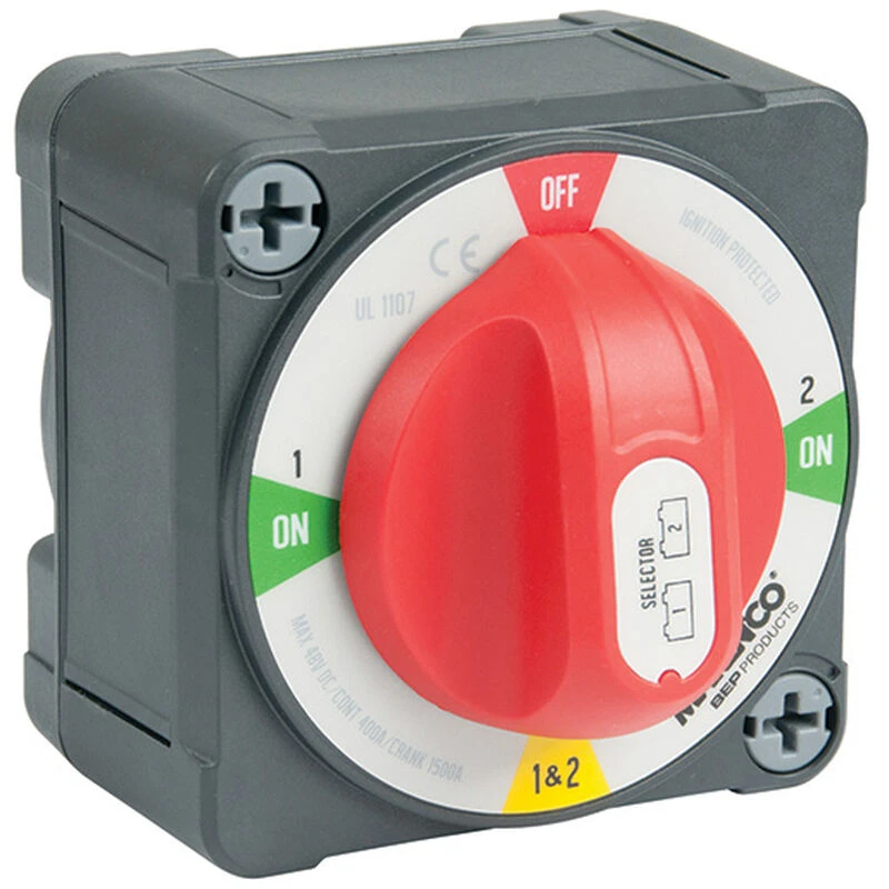 BEP/Marinco Pro Installer series components are designed to reduce installation times by making it easier. These revolutionary battery switches allow you to wire from the front. Simply remove the cover, mount the backing plate, run the wires, and then snap the cover and actuator back in place. Never has installation been so easy; battling stiff battery cables while trying to mount the switch has been eliminated. These high quality, durable switches accept large cables with multiple lugs, and feature intuitive, ergonomic switch positioning and clear graphics to indicate switch position.