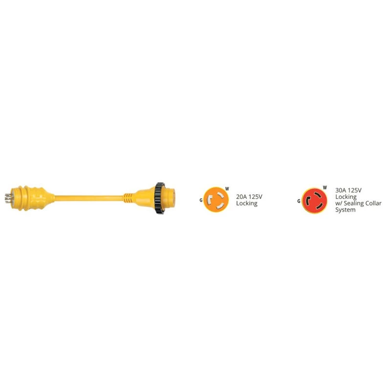 Water-resistant adapters are fully molded, include sealing collars that provide a watertight seal, and look like very short ShorePowerâ„¢ cord sets. Pigtail adapters allow you to connect from one dockside receptacle (or other power source receptacle) to one boat side inlet or equipment of dissimilar power configuration. The flexible marine grade cable provides increased range of motion and strain relief at the connections.