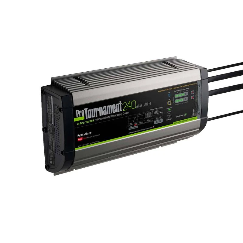 The advanced technology of the ProMariner ProTournament Elite 240 enables this waterproof charger to restore your batteries 3-5 time faster allowing you to hit the water in the morning—even if you didn’t get home until after dark. This 2 bank charger ensures that all of the available charging amperage is fully utilized to meet the unique demands of each onboard battery bank and charge it in the most efficient way. A 5-stage charging sequence digitally analyzes each battery bank and adjusts the charge rate to safely and efficiently charge the batteries while extending battery life. Promariner’s unique Distributed-On-Demand technology divides the 24amps of charging capacity as needed between the 2 banks for a faster charge; meaning available charging amperage is tailored to each bank, not simply 12 amps to each bank. The 240 Elite features a waterproof forced induction cooling fan to prevent overheating and to maintain a high rate of charge.