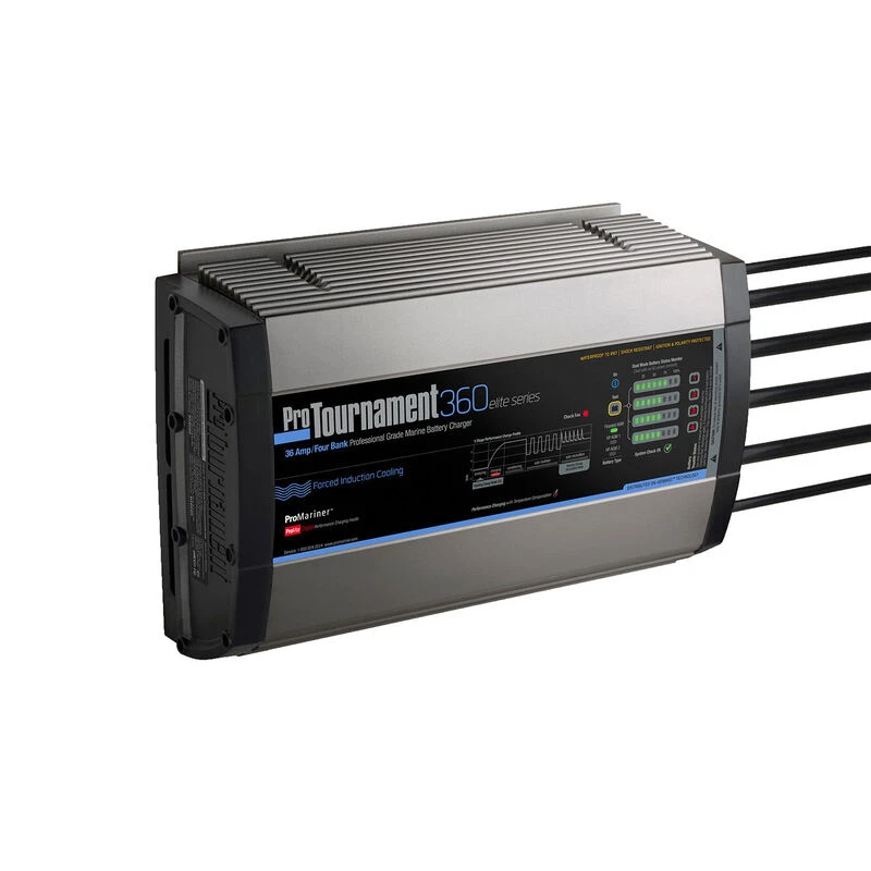The advanced technology of the ProMariner ProTournament Elite 360 enables this waterproof charger to restore your batteries in as little as 4-8 hours allowing you to hit the water in the morning—even if you didn’t get home until after dark. This 4 bank charger ensures that all of the available charging amperage is fully utilized to meet the unique demands of each onboard battery bank and charge it in the most efficient way. A 5-stage charging sequence digitally analyzes each battery bank and adjusts the charge rate to safely and efficiently charge the batteries while extending battery life. Promariner’s unique Distributed-On-Demand technology divides the 36amps of charging capacity as needed between the 4 banks for a faster charge; meaning available charging amperage is tailored to each bank, not simply 9 amps to each bank. The 360 Elite features a waterproof forced induction cooling fan to prevent overheating and to maintain a high rate of charge. Charge quickly and get back on the water sooner with a ProMariner ProTournament Elite charger.
