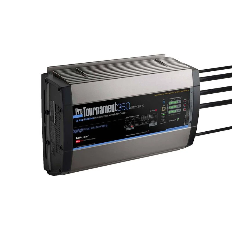 The advanced technology of the ProMariner ProTournament Elite 360 enables this waterproof charger to restore your batteries in as little as 4-8 hours allowing you to hit the water in the morning—even if you didn’t get home until after dark. This 3 bank charger ensures that all of the available charging amperage is fully utilized to meet the unique demands of each onboard battery bank and charge it in the most efficient way. A 5-stage charging sequence digitally analyzes each battery bank and adjusts the charge rate to safely and efficiently charge the batteries while extending battery life. Promariner’s unique Distributed-On-Demand technology divides the 36amps of charging capacity as needed between the 3 banks for a faster charge; meaning available charging amperage is tailored to each bank, not simply 12 amps to each bank. The 360 Elite features a waterproof forced induction cooling fan to prevent overheating and to maintain a high rate of charge.