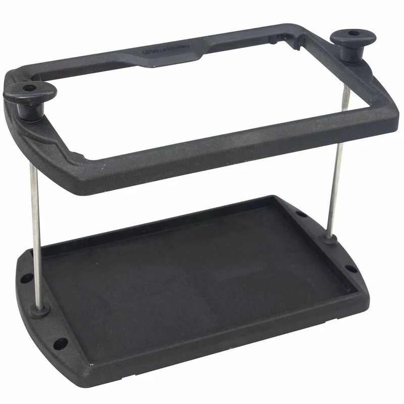 Our trays hold batteries securely in a sturdy frame made from noncorrosive, rigid black polypropylene. Two 1/4″ stainless-steel tie rods with adjustable self-locking security knobs hold the frame in place while providing access to the battery top and terminals. Our hold down trays have a pre-drilled base that allows easy installation. Ideal for applications that do not require batteries to be completely encased.