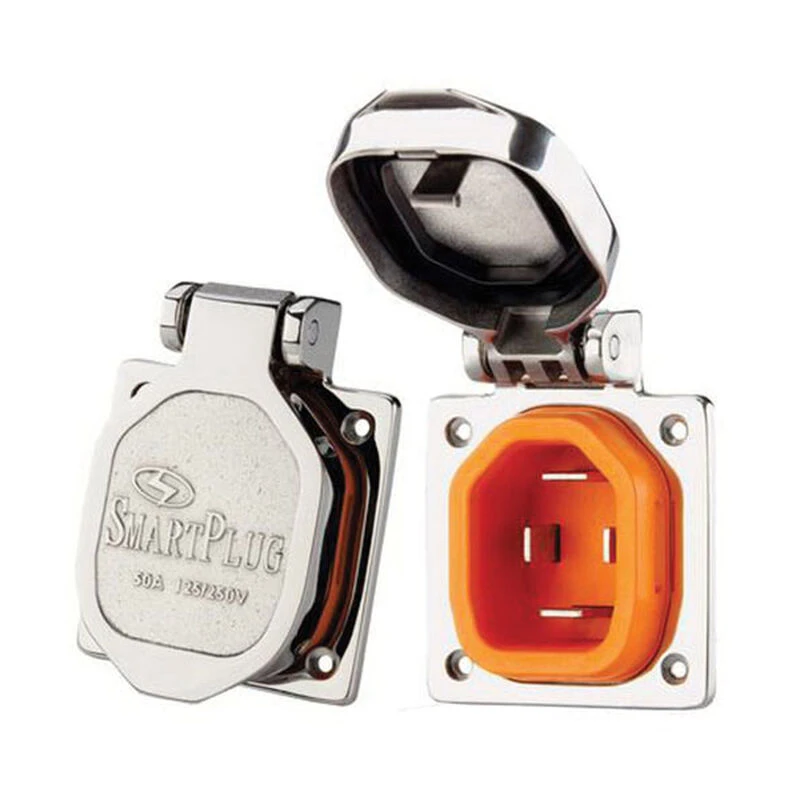 The SmartPlug 50 Amp Stainless Steel Inlet is easily retrofitted to the existing four-hole pattern and footprint of the traditional twist type inlet. The Inlet cap and flange are made of Grade 316 stainless steel and also have multiple locking points to ensure the plug is safe and secure.
