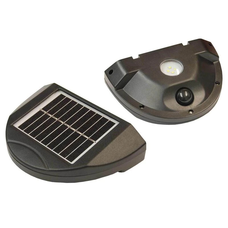 Taylorbrite® Solar Powered LED Motion Sensor Overhead Light turns on automatically at sunset. Light is constantly on at dim light (15LM) then brightens (135LM) when it senses motion. User replaceable lithium 18650 battery.