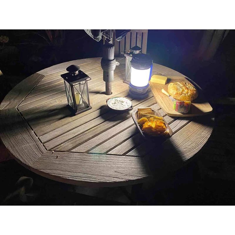 It has two open opposing hanging hooks so you can get the light where you need it most. The lithium battery is conveniently charged through a USB port and it has an outbound USB port to charge your small electronic devices from the internal battery. Charging cable and device not included.