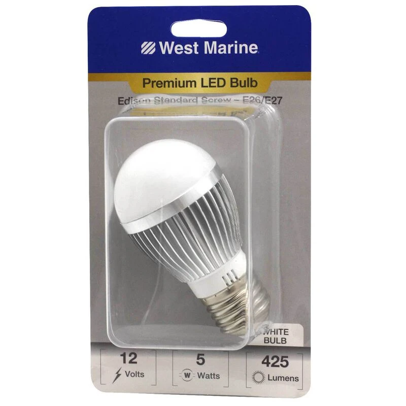 The WEST MARINE Edison Standard Screw E26/E27 LED Premium Bulb uses cutting edge LED chips, drivers and construction offering the highest levels of performance, efficiency, and reliability. This results in dramatically reduced power consumption while having greater light output than the majority of bulbs of its size. It will produce bright flicker free light which will render true and vibrant colors, and reduce eyestrain compared to lower quality LED bulbs. This is achieved using high efficiency chips and drivers which produce more light output per watt of power consumed.
